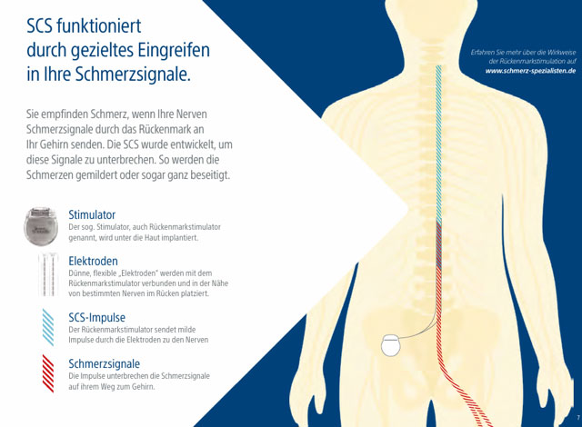 Die Rücken­marks­sti­mu­la­ti­on (SCS für „spi­nal cord sti­mu­la­ti­on“) ist seit mitt­ler­wei­le Jahr­zehn­ten ein inno­va­ti­ves und viel­sei­ti­ges Ope­ra­ti­ons­ver­fah­ren in der Schmerz­the­ra­pie, sofern eine medi­ka­men­tö­se Schmerz­the­ra­pie kei­ne aus­rei­chen­de Lin­de­rung erreicht.